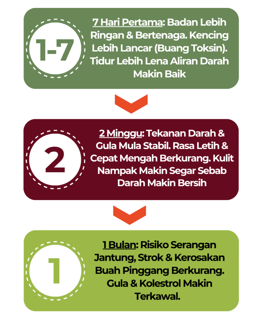 Kesan bergantung pada tahap kesihatan setiap individu. Ada yang rasa perubahan seawal 1–2 minggu, ada juga yang perlukan masa lebih lama untuk nampak kesan. Amalan konsisten sangat penting untuk dapatkan hasil yang terbaik.